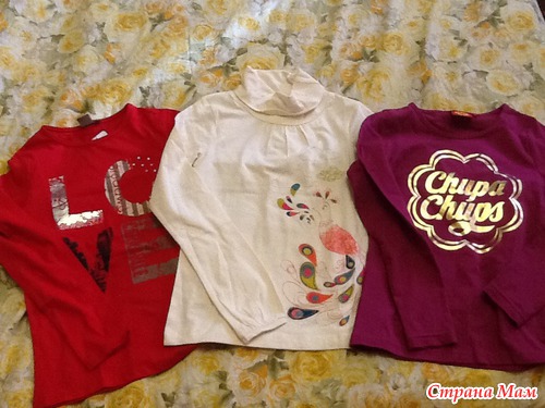 3 кофточки х/б для дочки. Нам 8 лет, рост 135. Брала размер на 10 лет. Кофточки справа и слева впритык. Средняя водолазочка чуть больше. Качество отличное!!! Очень приятные на ощупь. Рисунки нанесены качественно!!