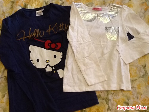 Еще 2 кофточки. Слева фирма Хелло Китти-размер 12 лет. Белая другой фирмы -рост 10 лет. Почувствуйте разницу. Белая мала очень!!! Не знаю почему так вышло... Белая той же фирмы, что и кофточки на прошлом фото, но меньше их в разы((((( ну, будет ждать, когда племянница подрастет)))))