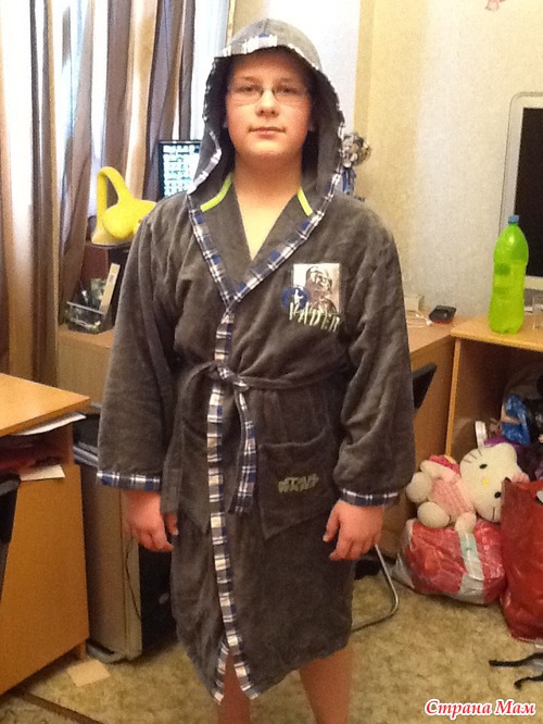 Халат на сына. Это вообще-супер вещь!!! Во-первых Паша у нас животастенький)))) и я боялась, что не подойдет, но опасения были напрасны. Отлично сел!!! Хорошо впитывает влагу, качественный, красивый!!! Супер!!!