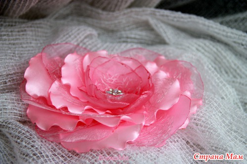 А последний придумала сама:там атласная лента 8см шириной, бантик тоже такой же ширины и сеточка.Вырезала как лепесточек,атласную ленту при нагревании растягивала,а бантик просто опалила над свечкой, сеточку вырезала просто.Приклеивала в нахлестом друг на друга. А внутри просто из бантика опалила круги и собрала цветочек. Прикрепила на зажим.