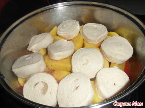 -на картофель выкладываем нарезанные шайбы НЕ РАЗВЕРНУТОГО магазинного теста для пиццы