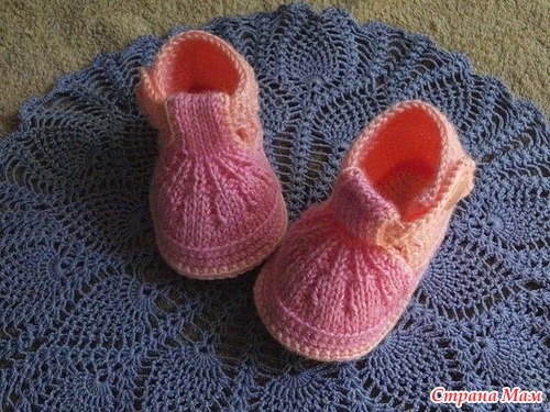 Подошва-крючоком. Далее 3-2 ряда столбиками без накида. прямо по краю подошвы. Потом вяжете на спицах. Делите работу на2части и вяжете отдельно носок (резинкой1 изн -5 лиц, через каждые 4 ряда убавляете по краям по 2 петли, а также в месте, где изн -3 петли вместе) пятку (лицевыми) ремешок для застёжки - крючок. В конце сшиваете обе части приблизительно1,5 - 2 см от подошвы.