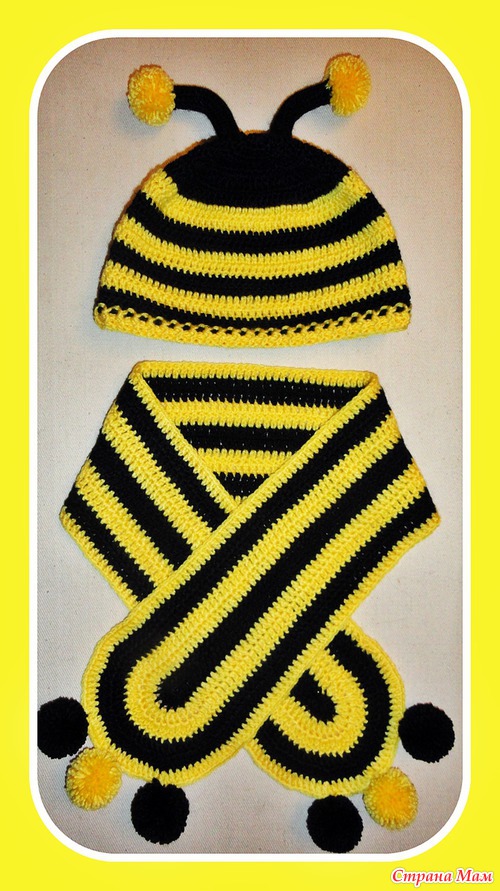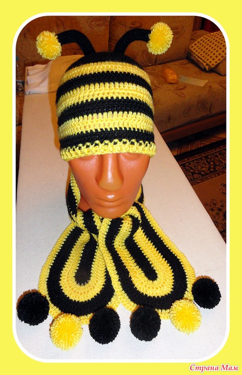 шапку вязала от макушки ссн, чередуя по 2 ряда желтого и черного цвета, а усики - связала "трубочку" сбн (длину наугад) и к одному концу пришила помпончики. ВСЕ НА ГЛАЗ!