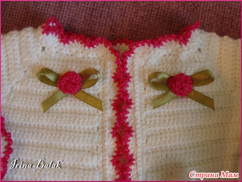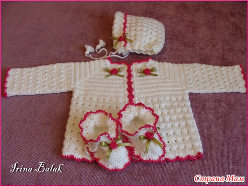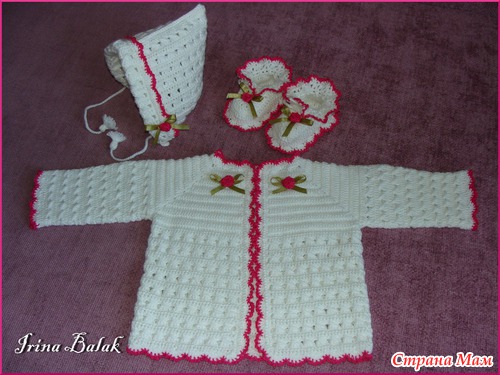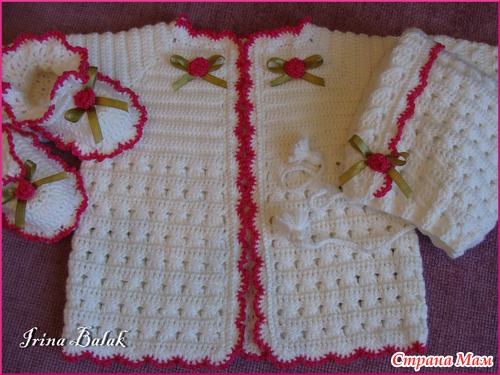 Связался комплект " Колыбельная", для новорожденного Кофточка, шапочка и пинетки. Украшен вязаными розочками и бантиками из атласной ленты. Связался но одном дыхании, для маленького вязать одно удовольствие.