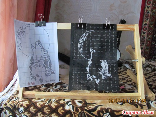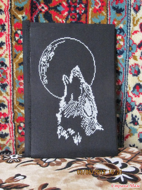 Девочки хочу выставить на вашу оценку свою первую работу на чёрной канве. Давно всё собиралась. Настроена была вышить мак на чёрном фоне (где то увидела и очень понравилось). На пока подходящего мака не нашла -наткнулась в инете на этого волка -монохром. Решила вперёд волк -потом мак. Правду говорят что тяжело вышивать на чёрной канве- глаза устают.