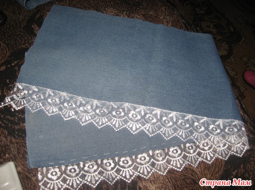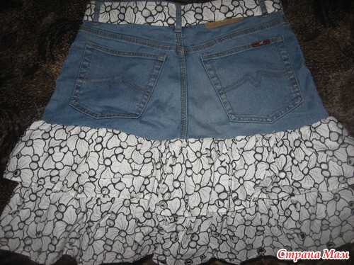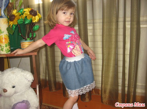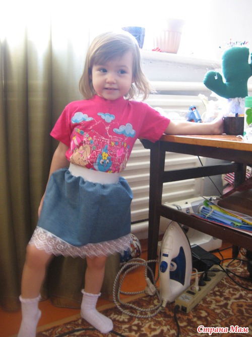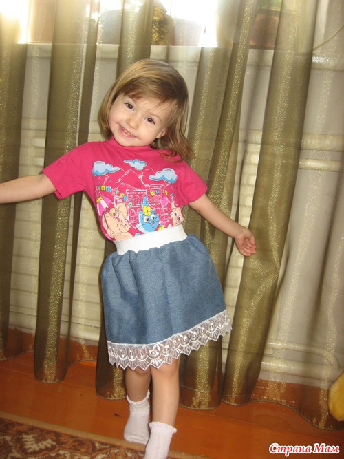 Сразу же сшилась дочке юбочка, из такого прямоугольника вырезанного из одной штанины, пришилось кружево, а потом широкая белая резинка.