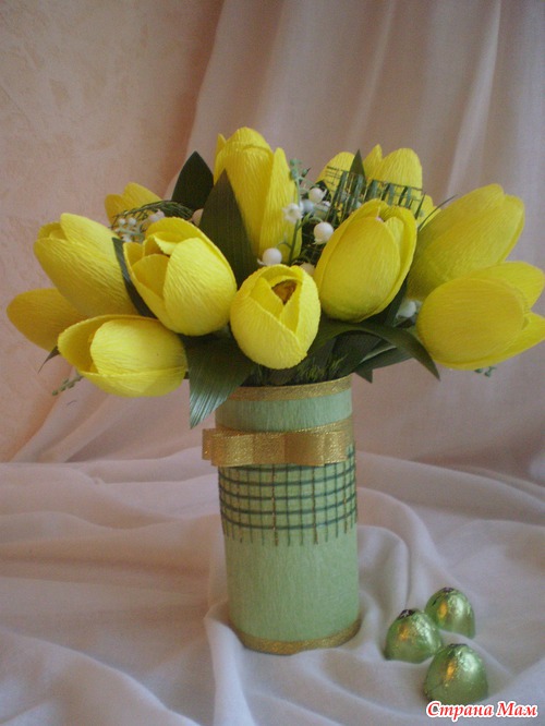 Спасибо Да, бумага нужна флористическая. Она жесткая и хорошо держит форму. Вообще, некоторые по интернету заказывают на сайтах, где разные флористические и упаковочные материалы продаются. А МК по тюльпанам попробую сделать и выложить, если Вам интересно. Просто никогда не делала.