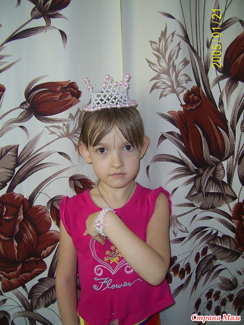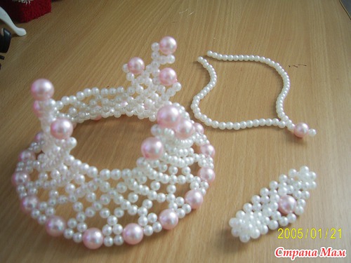 Решили мы с доченькой к новому году (к утреннику) корону не покупать, а своими руками сделать. А так как заранее схемку не подобрали, бусин купили побольше. Так вместе с короной образовались еще браслет и колье простенькое. Правда на фото здесь оно еще без застежки, т. к застежку приделали позже. Основа короны специально сделана пошире, чтоб лучше держалась.