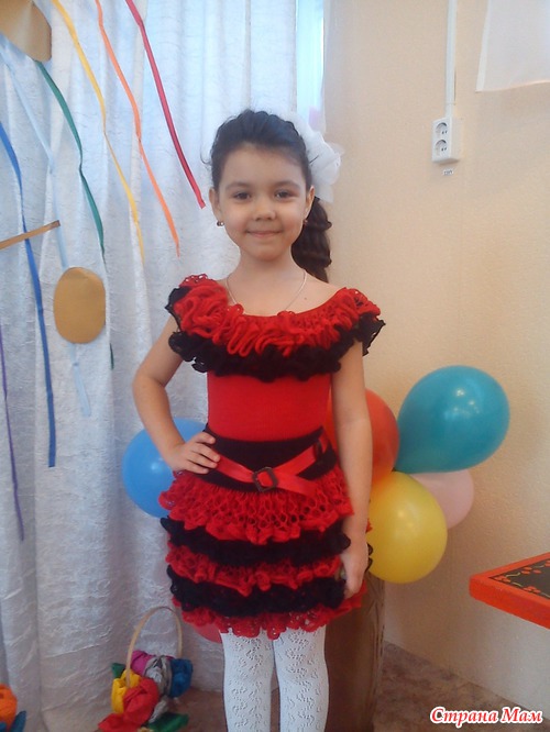 Еле-еле успела за неделю. Ушло по мотку Дантелы(совсем немного осталось), по полмоточка черного и красного Лотоса на юбочку и моток Ализе дива стрейч на футболку. Юбочка быстро связалась, а футболочка нервы потрепала. Так как ниточка стрейчевая, то полотно вязалось дольше, чем обычными нитками. Но результат стоил моих мучений. И футболку можно носить в двух вариантах: поднять лямки на плечи или опустить пониже. На утреннике наш наряд очень выделялся на фоне розовых и белых платьев. Доча была ОООЧЕНЬ ДОВОЛЬНА.