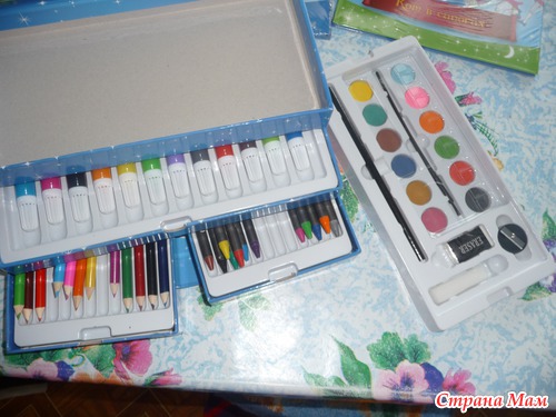 а внутри вот что: акварельные краски, ластик, точилка, карандаш, наборы цв карандашей, восковых и набор фломастеров, ящички все выдвигаются, так интересно, закрывается сундучок на липучки и ручка вон сверху