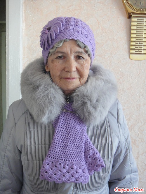 Прелесть! Третий комплект: сиреневая шапочка и шарф, просто чудо! Очень понравился цветочек! Пожалуйста, пришлите схему цветочка или ссылку на него, очень надо. Спасибо!!!