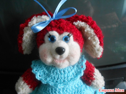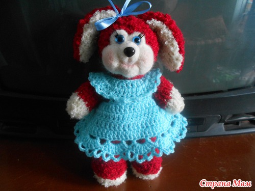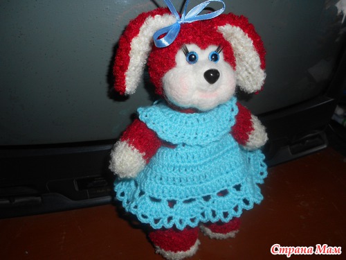Вязала без схем придумывалось по ходу вязания. Тело и голова связаны вместе одной частью. Ручки ножки и ушки пришиты. Платье ниточки Пехорка Бисерная.