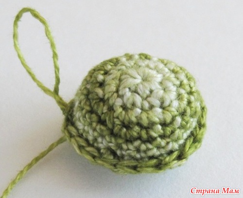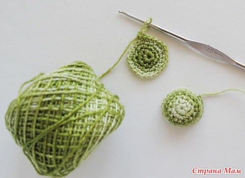 Вначале свяжем серединку зеленой меланжевой пряжей. Она состоит из двух частей, которые вяжутся по спирали.