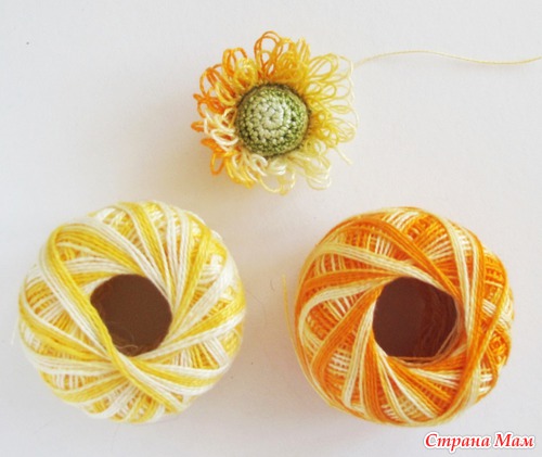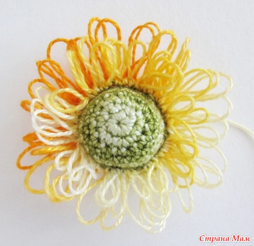Теперь перейдем к вывязыванию "тычинок". Для этого можно взять меланжевую пряжу светло и темно-желтых оттенков.