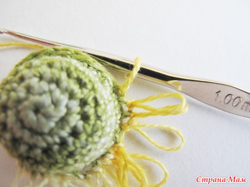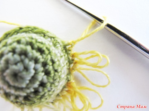 За верхнюю стеночку петель последнего ряда зеленой серединки захватывайте короткие вытянутые петли светло-желтой пряжей, за нижнюю - длинные вытянутые петли темно-желтой пряжей. Как сделать вытянутые петли, показано на фотографиях ниже.