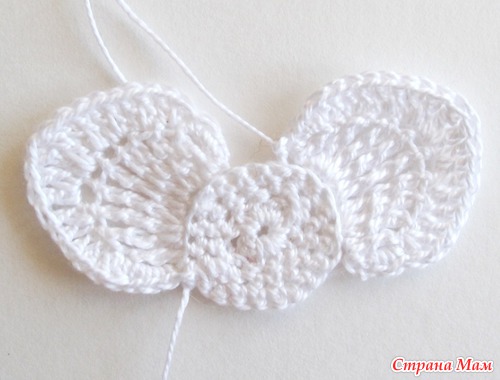 Белым "Ирисом" свяжем 5 лепестков. На схеме птичками помечены 2 лепестка которые находятся над остальными тремя.