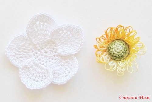 Жизнерадостная желтая серединка, напоминающая Солнце, в обрамлении пяти нежных лепестков. Для вязаного воплощения я использовала тонкую хлопковую пряжу "Ирис" и крючок №1.