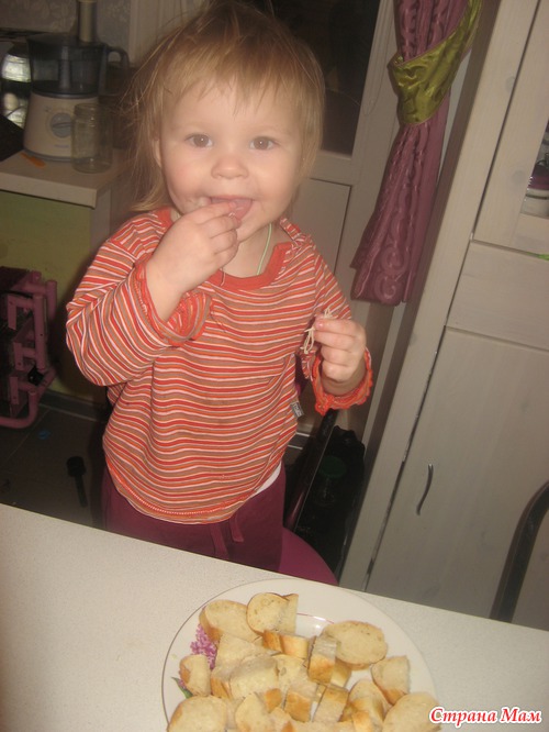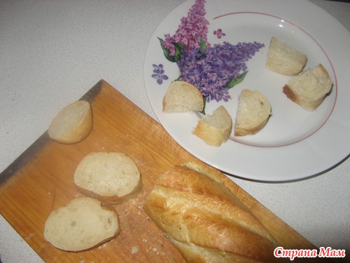 Нарезаем багет на кусочки - такие, которые удобно подцепить вилкой... И ставим на пять минуток в духовку - чтобы немного запеклись