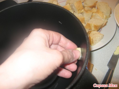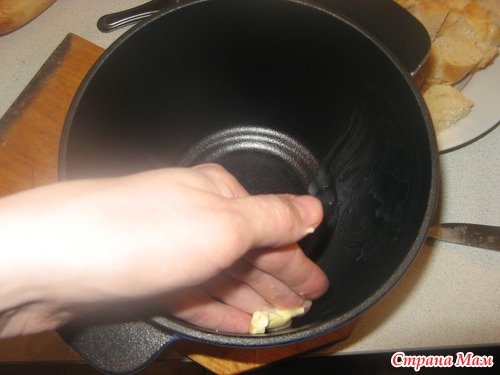 Теперь натираем чесноком стенки и дно нашей кастрюльки. В идеале - это фондюшница. Но мы три года обходились обычной мисочкой и подставкой со свечами-таблетками. И ничего, было вкусно