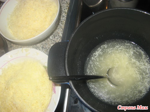 Начинаем понемногу, по чуть-чуть добавлять сыр. Добавили - растворилось - еще добавили...