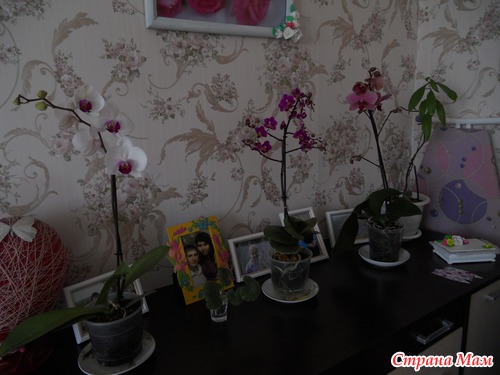 Орхидеи просто прелесть, но фон для них я бы другой выбрала! Фиалка у меня такая есть, листья у нее большие. Когда растюшки цветут и настроение праздничное!