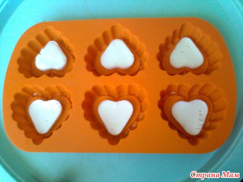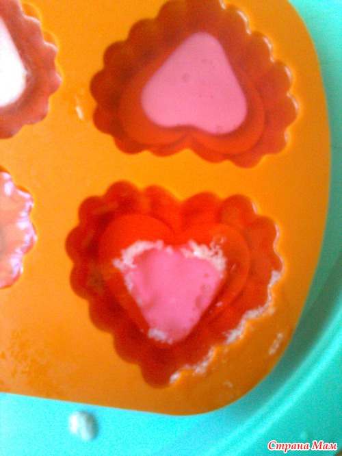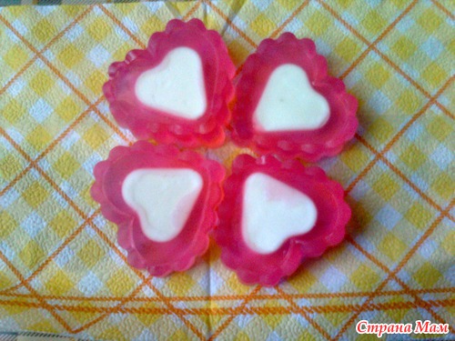 Мыла сделаны из мыльной основы (розовый фон). Белое сердечко - это перетопленное детское мыло с молоком.