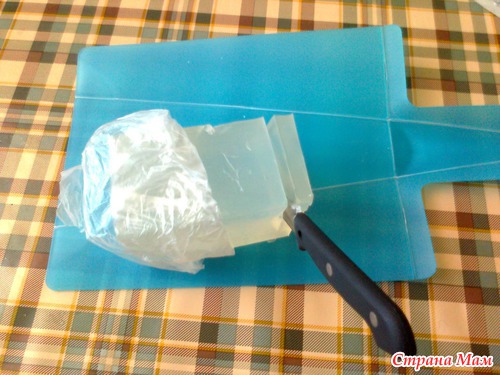 Отрезаем кусок от мыльной основы (нам нужно 100 грамм). На самом брусе основы есть насечки, определяющие поперечный срез в 100 грамм. Срезала, взвесила - 100 грамм.