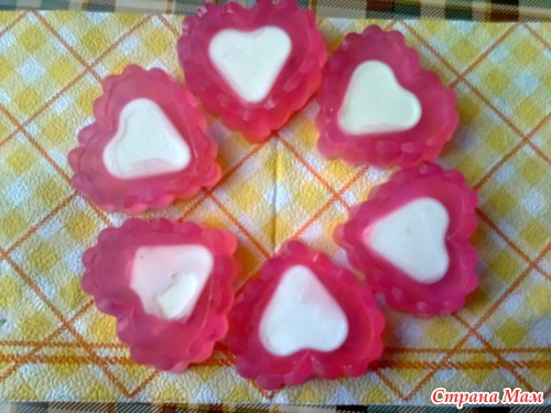 Мыла сделаны из мыльной основы (розовый фон). Белое сердечко - это перетопленное детское мыло с молоком.