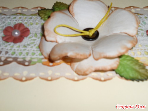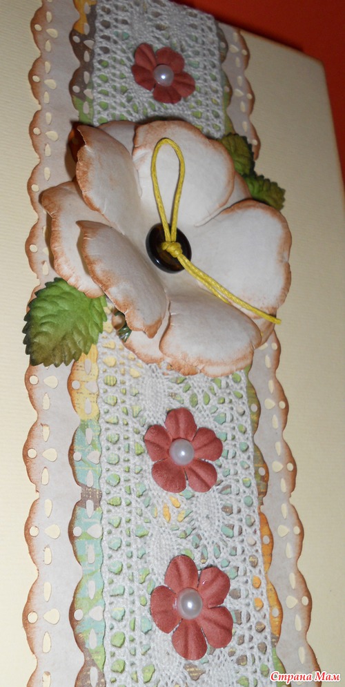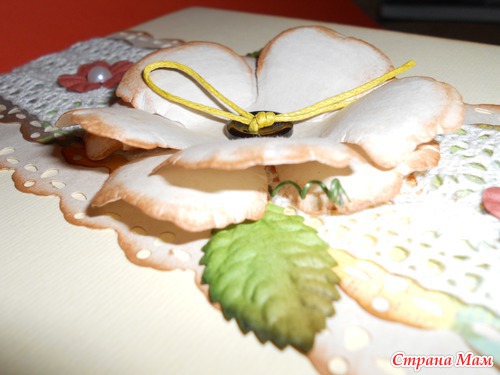 Очень интересная идея использования жидкого жемчуга (если не ошибаюсь), очень аккуратно, капельки маленькие будто роса сияет, хорошо вписывается в задумку под эту бумагу. Насколько я вижу, прошивание Вы не использовали, если не секрет, на какой клей вы клеили кружево, должно быть очень крепко держит, у меня похожее лежит, пока не нахожу как его вписать.