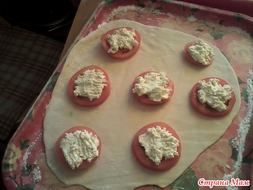 Разложила на тесто кружочки помидоров.