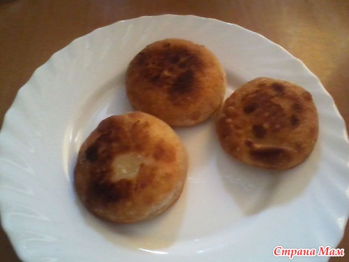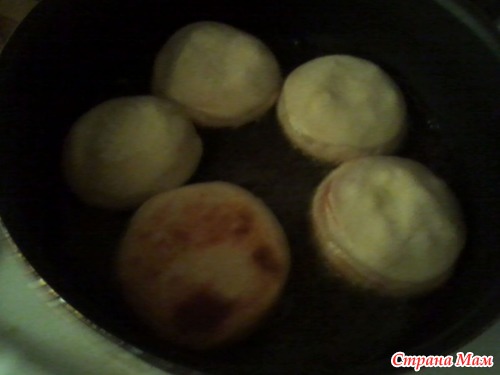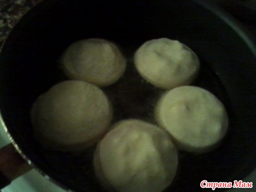 Жарила пирожки в большом количестве раскалённого растительного масла с обеих сторон.