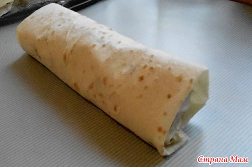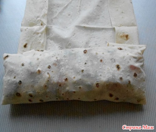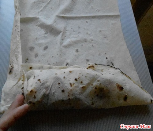 Накладываем начину к себе поближе, накрываем краем лаваша, подгибаем края срава и слева и сворачиваем полностью