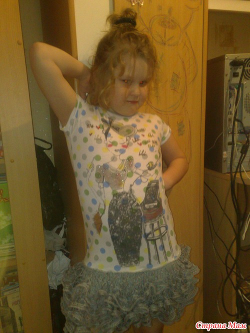 То, что получилось пришила (старшая дочь этим занималась) к футболочке и вот итог: