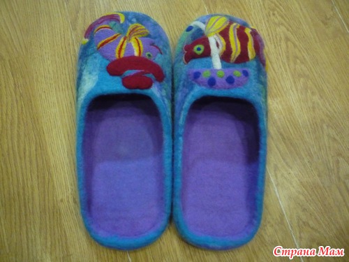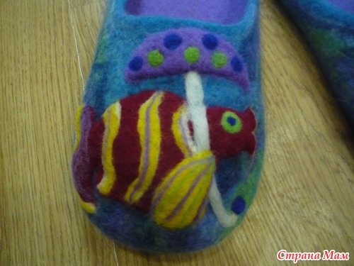 Марин! Ну как всегда, слов нет, просто супер, я в полном восторге, особенно тапульки ’’На морской глубине’’, только если не обидишься можно совет, ни как от ни разу так и не свалявшей тапочки, а от человека который рисует: рыбку в шляпе надо отбить от фона (скорее всего белой шерстью тоненько по контуру), на счёт нужно ли отбивать от фона вторую даму, с зонтиком, станет понятно когда первую отобьешь. Прости если не уместно моё мнение...
