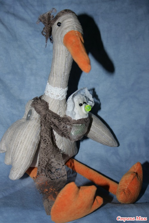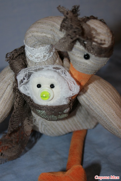 Хочу показать и я своего аиста из совместного пошива с девушкой с иголочкой. Времени ходить по магазинам в поисках ткани не было, поэтому пошерстила свои запасики. Наскребла подходящих тканей и вот она моя девочка. Сумочку решила не делать а вручила аистихе слинг, и модно и удобно. Ребеночка она одного пока несет, он с желтой соской, чтобы не догадались мальчик это или девочка.