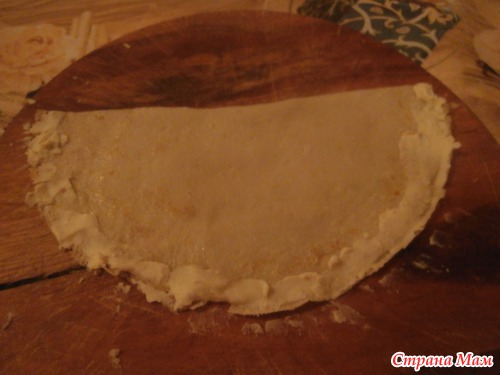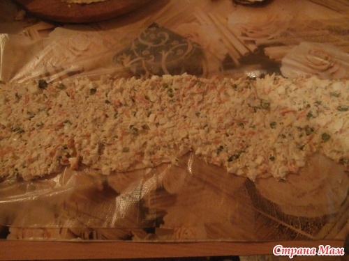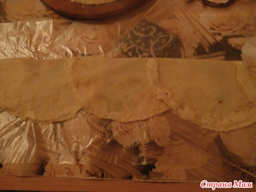 на столе разложить пленку (у меня 3 пакетика из рулона.. оторвала не разрывая).. и разложить блинчики немного внахлест (сверху половинки побольше)... я делала из 7 половинок..