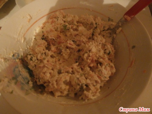 Для начинки смешала грудку, измельченные яйца, морковь, потертую на крупной терке и измельченную зелень.. посолить+ майонез...