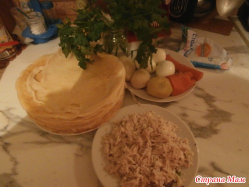 Для начинки смешала грудку, измельченные яйца, морковь, потертую на крупной терке и измельченную зелень.. посолить+ майонез...