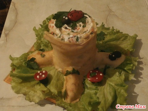 установить пенек на тарелку и сделать корешки.. немного начинки и сверху блинчики..
