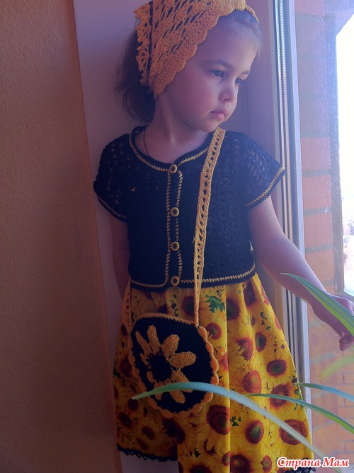 Нитки :черный Ирис - всего три моточка по 25гр. (на платье и кофту) и остатки желтого и черного семеновского Кабле. Ткань - 35см. (ширина ткани 110см., стоимость - 480рублей - метр) и пуговицы - 9шт - 150рублей.