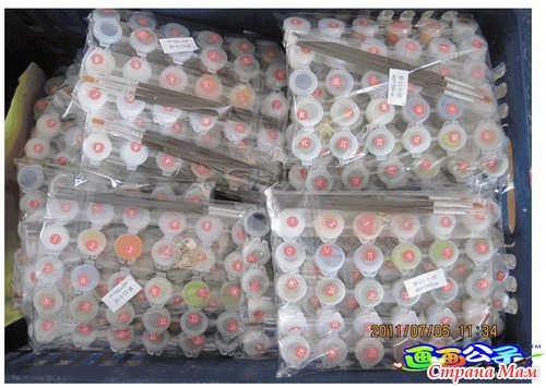 А потом уже разливаются по тем маленьким пронумерованным баночкам и по той цветовой палитре, которую ранее составлял художник.