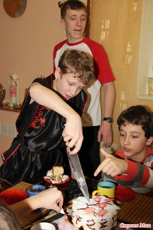 Потом был торт, испеченный братом. Правда с мастикой не получилось и торт выглядел непрезентабельно, но был вкусным.