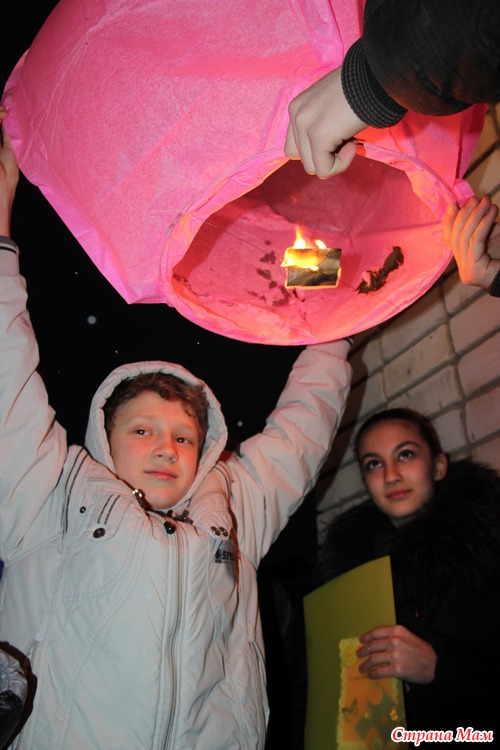 На прощание запустили фонарик желания. Был ветер и шел снег, фонарик подгорел и летел плохо. Все равно надеемся, что желания сбудутся!
