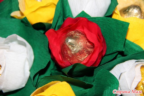 Два квадрата 10*10. Посередине сделать дырочку. Расположить... буквой Х чтоли. Крест накрест, по диагонали не знаю как объяснить... Собрать в складку у основания. Опустить чуть ниже основания конфеты чтоб можно было закрепить на стебле (у меня палочки для шашлыка).