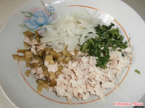 Салат, что называется, на быструю руку и из того, что было.. осталось немного куриной грудки от запеченной курицы + немного зелени, маринованный огурчик и лук (залила кипятком + чуть-чуть уксуса и постоял, пока нарезала остальные продукты).. слегка посолить, поперчить и добавить майонез..