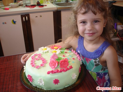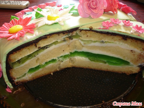 Продолжаю обучаться работе с мастикой. Вот такой тортик, для всех моих гостей на 8 Марта. Коржи бисквит+взбитые сливки+прослоечка из желе с киви. Критика принимается. А это вид в разрезе: И дочка с тортом: Читать полностью