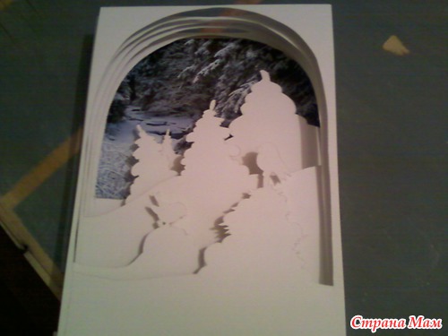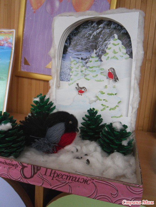 Идеей для изготовления послужил рисунок из детской разукрашки. Мы его перевели с помощью копировальной бумаги на отдельные листы белого картона и разложили на слои, получилось их 5. Для фона выбрали зимний лесной пейзаж. Вырезали, разукрасили и склеили все "слои", прокладывая полосками поролона нужной ширины. Ёлочки перед картиной - выкрашенные сосновые шишки, а снегиря сделали с помощью шарика от настольного тенниса и обмотали его пучками ниток трех цветов: для крыльев, спинки и красной грудки.