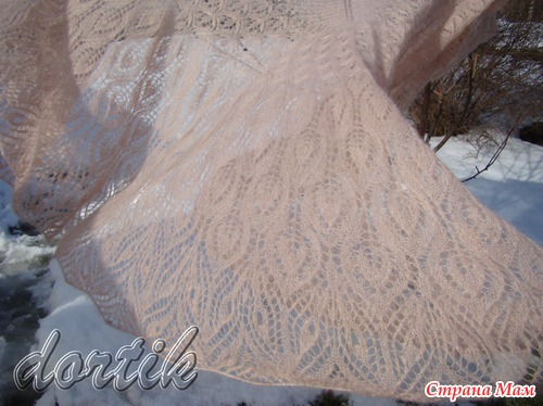 Сегодня почти завершила вязание переходной схемы С. Так как очень хотелось посмотреть что же у меня получается (а заодно и испытать недавно приобретенные переходники для наращивания лески), то решила я немного растянуть шаль и сделала фото. Вот парочка снимков того, что у меня получилось: