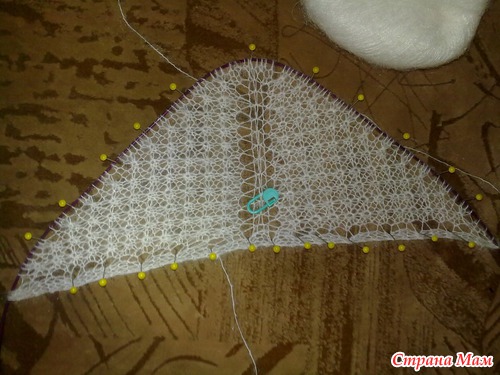 ), сильно растянуть шаль не получилось, поэтому только в нескольких местах наколола иголочками с чуть большим растяжением (чтобы увидеть прорисовку листиков.).