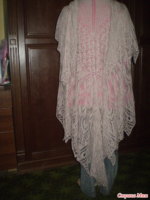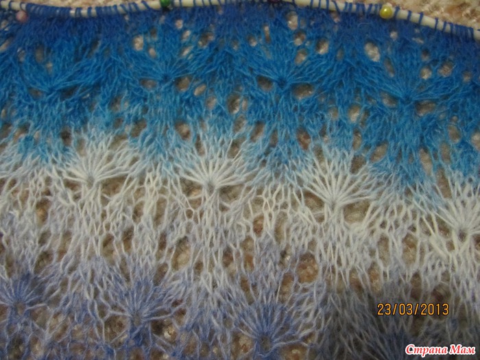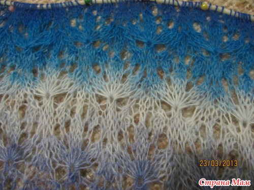 Сегодня почти завершила вязание переходной схемы С. Так как очень хотелось посмотреть что же у меня получается (а заодно и испытать недавно приобретенные переходники для наращивания лески), то решила я немного растянуть шаль и сделала фото. Вот парочка снимков того, что у меня получилось: